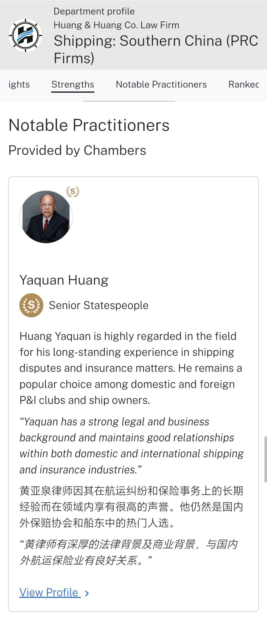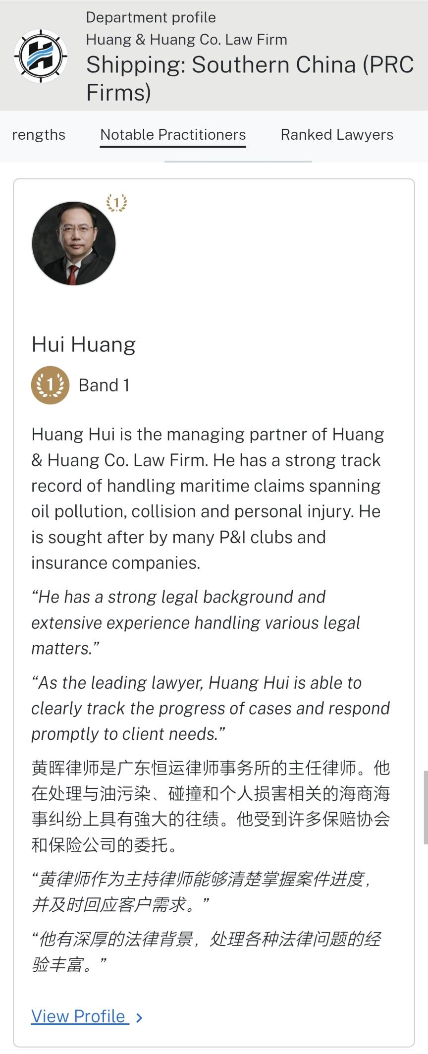 广东恒运律师事务所创始合伙人黄亚泉律师及主任黄晖律师荣获Chambers and Partners最高级别奖项。创始合伙人黄亚泉律师连续18年卫冕中国南部海商海事"业界元老(Senior Statespeople)",黄晖主任连续14年登榜并且于近年连续卫冕"第一级别(Band 1)"!