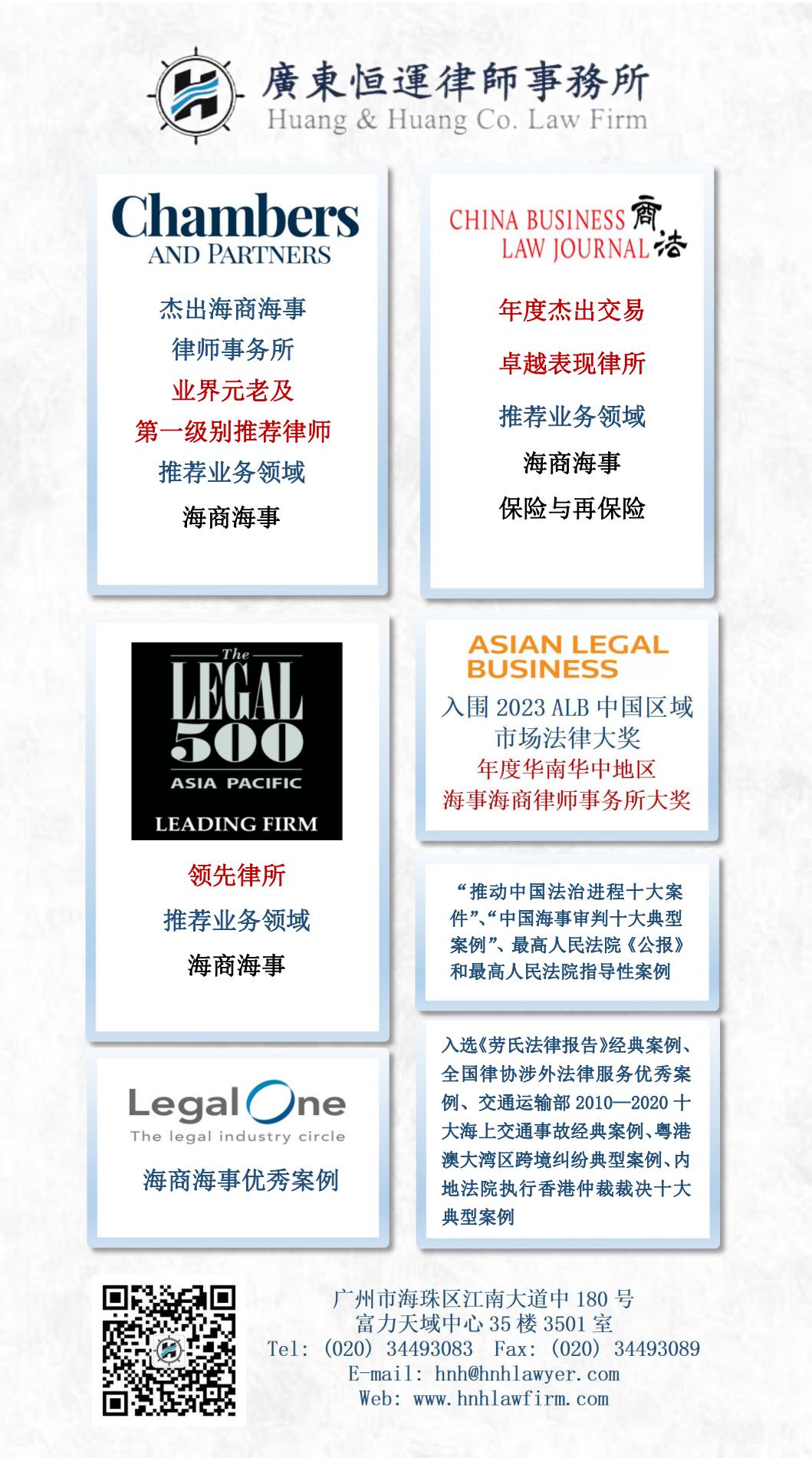 广东恒运律师事务所凭借深厚稳健的专业办案水平、丰富的疑难复杂案件处理经验、优秀的业绩表现和业界口碑、满意的客户服务反馈,连续14年登上《钱伯斯大中华区指南》榜单,并在“海商海事:中国南部 (中资律师事务所)”获重点推荐。
