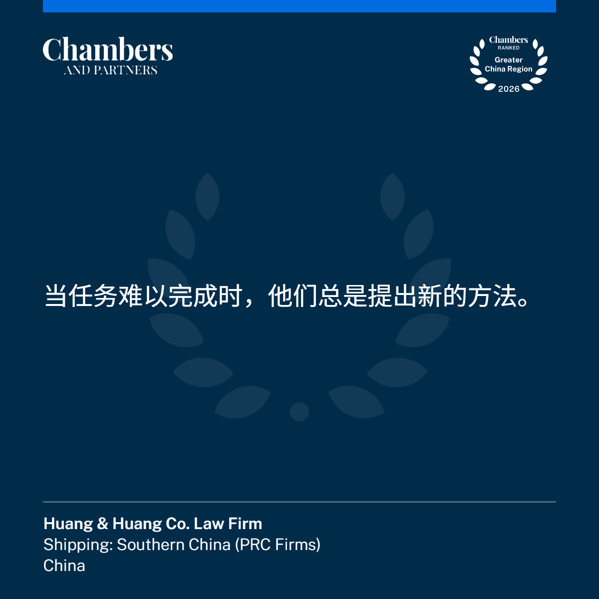 被誉为律师界"奥斯卡"的钱伯斯是全球领先的著名法律研究和评级机构,致力于发掘出色的法律人才,在全球范围内评选各领域顶尖律师事务所和法律专业人士。为保持研究的独立性,钱伯斯自豪地坚持独立和公正的研究和排名,因此研究过程从未授权,也不与任何第三方伙伴进行合作。《钱伯斯大中华区指南》提供可靠和公正的指引,确保任何人在寻求适合自身需求的法律服务时都能做出信息充足的选择决定。钱伯斯法律指南被视为业界基准,是国际客户寻求高端法律服务的重要参考。