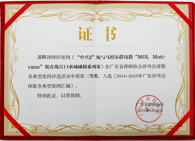 Our team led by Mr. Huang Hui has overcome sorts of difficulties and obstacles concerning the applicable law during the handling of the two selected cases. Facing with such complicated cases where various legal relationships were involved, we managed to untangle the facts, legal relationships of parties concerned and relevant provisions of domestic law and international conventions applicable to the cases, which can be very good references and citations in the disposition of similar cases. We are delighted to receive the recognition of Guangdong Lawyers Association of our professionalism and service level, and will continuously strive to provide high-quality and efficient foreign-related legal services to customers at home and abroad.